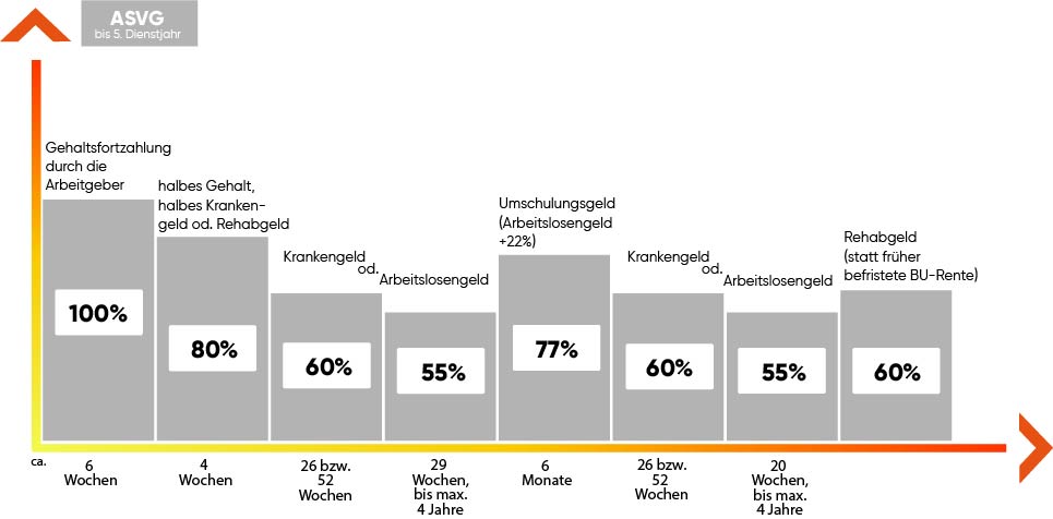 Laut PVA werden aktuell über 65% der Anträge auf eine BU-Pension abgelehnt!! Viele Menschen enden dadurch in der Mindestsicherung, wenn die Entgeldfortzahlung des Arbeitgebers und das Krankengeld aufhören. (siehe unten, wie der Verlauf deines Einkommens im Falle einer Krankheit aussieht.)